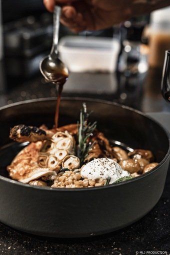 À l’entrée de Paimpol, au sein de l’hôtel Les Hauts de Kerano, Ostium s’affirme comme une adresse de caractère où l’exigence gastronomique s’exprime avec une évidente maîtrise. Le décor contemporain, sobre, élégant et lumineux, fait la part belle aux matières brutes et aux volumes ouverts. La cuisine, visible depuis la salle, instaure un dialogue direct entre le geste et l’assiette, soulignant la transparence d’une démarche fondée sur la précision. Aux commandes, le chef Nicolas Conan revendique un parcours à la fois enraciné et cosmopolite. Issu d’une famille d’agriculteurs bretons, il a affûté sa technique auprès de grands chefs avant d’enrichir son répertoire en Suisse. De ces expériences, il retient la rigueur des cuissons, la netteté des jus et un art subtil de l’assaisonnement, où les épices interviennent par touches mesurées, jamais démonstratives, toujours au service du produit. La carte reflète cette maturité. Les entrées, volontiers pensées pour le partage, dévoilent une écriture contemporaine : légumes de saison travaillés dans leur pleine expression, textures respectées, fraîcheur parfaitement maîtrisée. Les influences japonaises se lisent dans la précision des découpes et la délicatesse des équilibres, sans jamais brouiller la lisibilité du propos. La générosité demeure le fil conducteur, soutenue par une technique sûre et une réelle sensibilité gustative. Le plat signature, le magret de canard à la vieille prune, illustre avec éloquence la rencontre entre Bretagne et Périgord. La cuisson, d’une justesse exemplaire, préserve le moelleux et la profondeur aromatique de la chair : la réduction, concentrée et élégamment fruitée, apporte relief et longueur en bouche. L’assiette, structurée et ample, conjugue gourmandise et maîtrise. La dimension conviviale constitue l’autre signature d’Ostium. Grandes tables, cocottes à partager, cuissons à la braise et en rôtissoire : tout concourt à une expérience chaleureuse sans compromis sur l’exigence. Une salle des caves, plus confidentielle, aligne des flacons soigneusement sélectionnés, tandis qu’un espace privatisable répond aux attentes d’une clientèle professionnelle ou festive. Aux beaux jours, la terrasse ouverte sur le jardin prolonge cette hospitalité dans une atmosphère paisible. La carte des cocktails affirme une créativité maîtrisée, avec des compositions originales, structurées et équilibrées, proposées également en version sans alcool. Côté vins, le chef sommelier Romain Normand signe une sélection construite avec discernement, alternant références patrimoniales et découvertes pointues, choisies pour leur aptitude à dialoguer harmonieusement avec la cuisine. Coté sucré, le pâtissier Dylan Colven défend une pâtisserie de tradition exécutée avec précision : fonçages nets, produits parfaitement conduits, desserts lisibles et généreux. Des créations proposées sur place ou à emporter, prolongeant l’expérience au-delà du repas. À l’accueil, Anna Delmas, épouse du chef, reçoit les convives comme des amis de la maison, avec élégance, sourire et bienveillance, imprimant au lieu cette dimension humaine qui en fait toute la singularité. Entre racines bretonnes et inspirations périgourdines, enrichie d’échos venus d’ailleurs, la cuisine d’Ostium affirme une identité cohérente et vivante. Une table où la sincérité du produit, la justesse technique et le sens du partage composent une proposition gastronomique aboutie et où l’on mesure que la haute cuisine peut aussi être affaire de cœur.